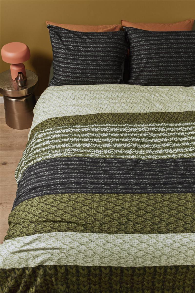 Het Beddinghouse Lance flanel dekbedovertrek ziet er prachtig uit in de slaapkamer. De verschillende banen in mooie groentinten zorgen voor een rustige sfeer en het breipatroon oogt knus en warm. Hierdoor is je interieur dan ook helemaal winterproof! De kleurencombinatie past goed bij vrijwel iedere woonstijl, terwijl het leuke patroon het overtrek een speels tintje meegeeft.